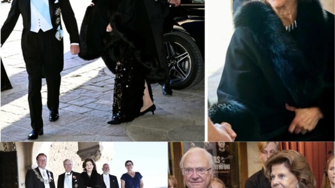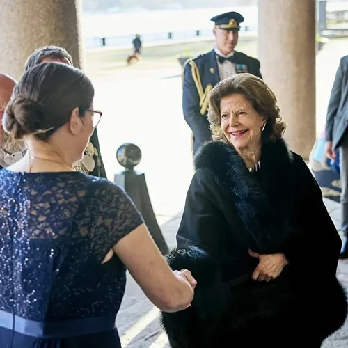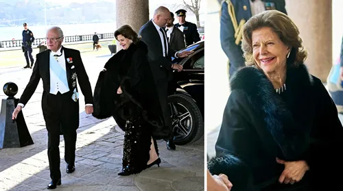 Drottningen valde även glittrigt svart vid galamiddagen på Vasamuseet den 29 januari. Och nu, den 31 mars, fick vi se henne i svarta paljetter – igen. Tredje gången gillt på bara åtta veckor.