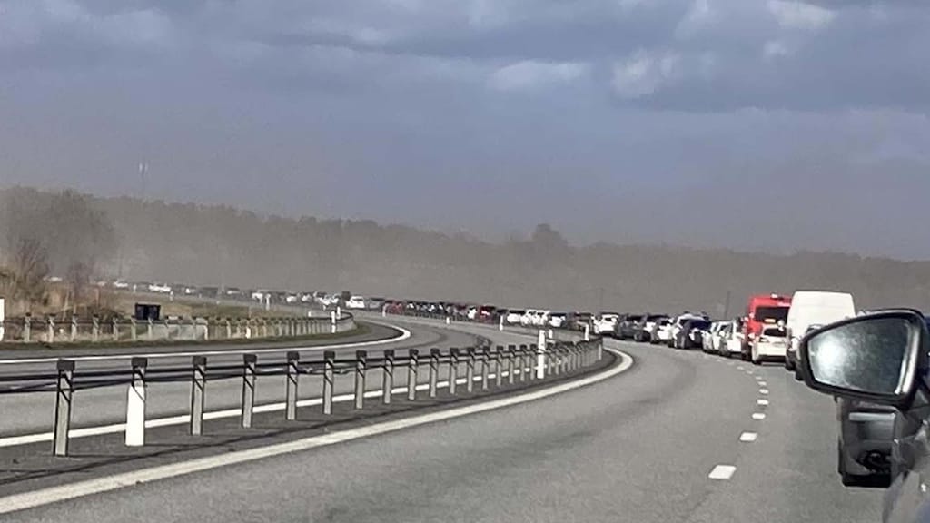Enligt polisen vände ett 20-tal personbilar i bilkön och körde mot färdriktningen efter krocken.