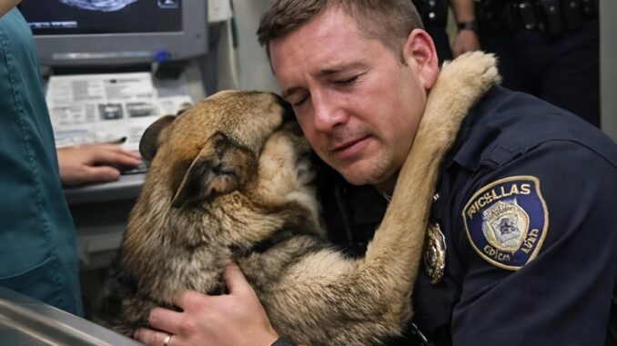 Officer Alex Voronov gick in i rummet och höll försiktigt sin tjänstehund tryckt mot bröstet. Den tyska schäfern Rex vägde nästan fyrtio kilo, men mannen bar honom nu som om det vore en liten valp.