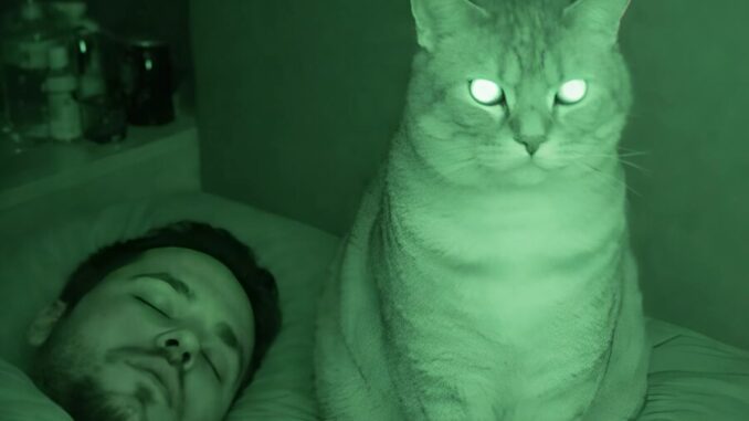 Nu vet vi: på nätterna är det inte kameran som håller ordning i vårt sovrum, utan katten.